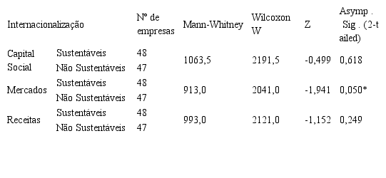 Com base nos resultados apresentados na Tabela 4, pode-se constatar que apenas uma das três dimensões de análise da internacionalização apontou diferença significativa na comparação entre as empresas sustentáveis e não sustentáveis: a internacionalização de mercados.