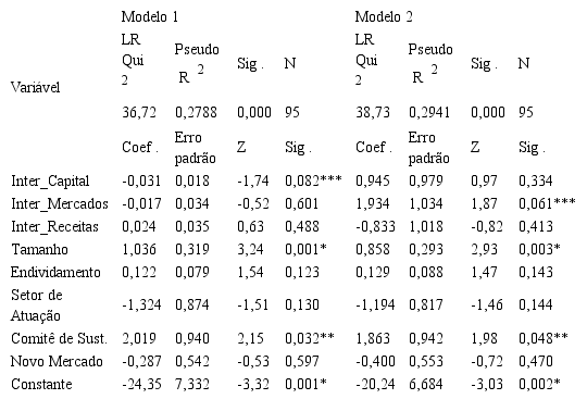 Desse modo, foi delineada a regressão logística, com o intuito de se comprovar a hipótese geral de que há uma relação positiva entre a internacionalização e a sustentabilidade empresarial no Brasil. Na Tabela 5, dispõem-se os resultados da regressão, provenientes da Equação 1 em dois modelos. No modelo 1 as variáveis de internacionalização foram contínuas, já no modelo 2 as variáveis foram estimadas a partir de dummy. As variáveis dummies foram definidas da seguinte forma: atribuiu-se o valor 0 (zero) para as empresas não sustentáveis, bem como para as empresas não internacionalizadas; e 1 (um) para as empresas sustentáveis, como também para as empresas internacionalizadas, nas três dimensões analisadas (capital social, receitas e mercados).