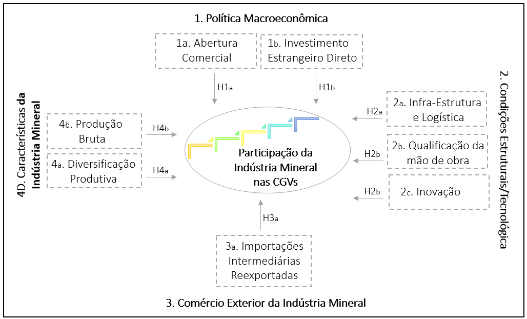 Assim, estas hipóteses serão testadas a fim de avaliar quais desses fatores são de fato determinantes da participação da indústria mineral nas CGVs. Esta investigação se faz importante em um contexto onde os governos buscam por estratégias de maior participação junto às CGVs, principalmente, para o setor extrativista (Smith, 2015). Por esta razão, os formuladores de políticas públicas estão procurando mais e melhores evidências que examinem a posição dos países e consequentemente de seus setores industriais dentro das CGVs (De Backer & Miroudot, 2014). Todas as hipóteses formuladas acima são mostradas na Figura 1: