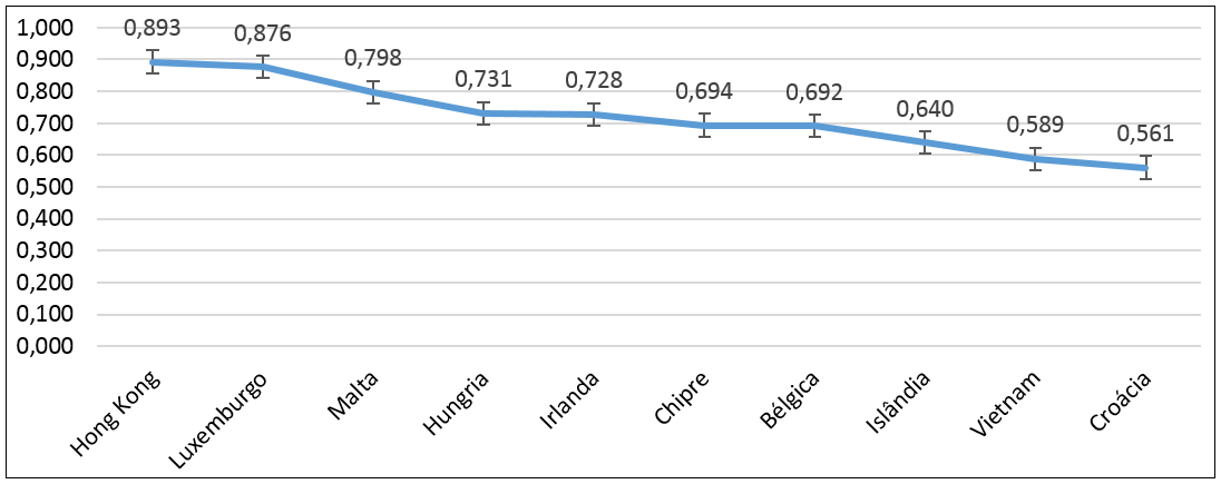 Um caso concreto que ilustra este raciocínio é o da indústria mineral da Croácia, a qual obteve o décimo maior índice de participação nas GGVs (“Pa”) entre os sessenta e dois países analisados (Figura 3). No entanto, esse país possui um déficit comercial em bens minerais e recentemente, deixou de extrair minérios de metais. A produção da indústria mineral deste país ocorre basicamente a partir de matérias-primas secundárias - advindas da reciclagem doméstica e da importação (Perez, 2014). Ou seja, além de ter baixa diversificação de bens minerais os dados sugerem que as commodities minerais importadas pela Croácia além de serem essenciais para a economia desse país ainda contribuem para a participação efetiva de sua indústria mineral nas CGVs.