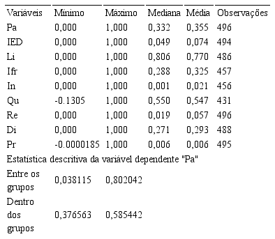 A análise da Tabela 2 aponta uma diferença significativa entre o mínimo e o máximo das variáveis - em especial, para a qualificação da mão de obra (Qu) e produção bruta. Isso indica uma alta discrepância entre os valores destas grandezas entre os países, além da presença de outliers. Quanto à variável dependente, Índice de participação da indústria mineral dos países nas CGVs (Pa), a Tabela 2 mostra que a média dessa variável é de 0,355, enquanto que, o valor mínimo é de 0,000 e o máximo dessa participação é de 1,000. A estatística descritiva dentro dos grupos apontou que a participação da indústria mineral de um mesmo país variou significativamente ao longo dos quinze anos analisados. Isso sugere como esta indústria pode ser influenciada por fatores externos, sobretudo, por fatores macroeconômicos e estruturais.
