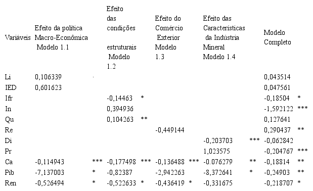 No que diz respeito as variáveis relacionadas às condições estruturais, nossos resultados também não confirmaram a influência da Inovação (In) para a integração da indústria mineral nas CGVs. Novamente, a dificuldade de encontrar proxies para a inovação para o período analisado, e de forma específica para a mineração forçou a escolha do número de pedidos de patentes registrado por país como alternativa. Sendo assim, são necessários mais estudos que analisem essa relação no caso da indústria mineral, pois as evidências de outros setores apontam uma influência positiva considerável da inovação e avanço nas CGVs (Giuliani et al., 2005; Haakonsson, 2009).
