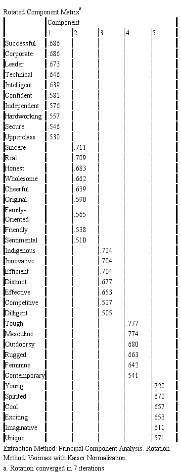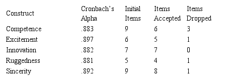 The data was analysed using Exploratory Factor Analysis to extract the major dimensions while traits in each dimension were further Factor Analysed to determine the facets. This is in line with Aaker’s (1997) methodology. Confirmatory Factor Analysis was used to validate findings, this method of analysis has also been used by Chi, Pan and Del Chiappa (2018) as well as Geuens, Weijters and De Wulf, (2009).