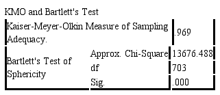 The results initially showed a 6-factor model, however, one of the factors only had one item and was subsequently dropped in line with Raubenheimer’s (2004) recommendation of a minimum of 3 items per factor. Thus, a 5-factor model (See Figure 1), which explained about 66% of the Total Variance, which is within accepted levels was adopted. The Kaiser-Meyer-Olkin Measure of Sampling Adequacy was sufficient (0.969) suggesting that the Principal Component Analysis was appropriate to use on the data (Usakli & Baloglu, 2011). The Bartlett’s Test of Sphericity (Table 2, p value < 0.01, Chi Square = 13676.488, df = 703) suggested that there existed enough correlations between the variables to run a factor analysis and that there was a good model fit (Aaker, 1997).