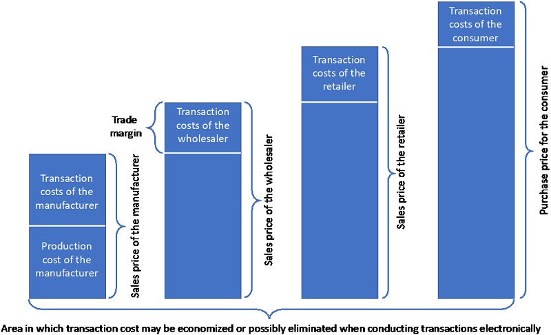 Transaction cost savings may be reached using information and communication technology within the entire marketplace hierarchy, resulting in efficiency in the market or industry value chain. A potential exclusion of entire levels within the market hierarchy (e.g., wholesaler, retailer) may occur. This phenomenon of disintermediation leads to a low-cost coordinative transaction, thanks to interconnected networks and easily accessible databases ( Wigand, 2003).