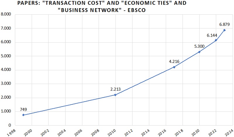 The words used in the main search were: "transaction cost" AND "economic ties" AND "business network". These elements were based on transaction cost theory, business network theory, and relational view. The search looked into academic journals. The search results are presented in Figure 3, when no filters were used, to give a general perspective of the academic research in this field.
