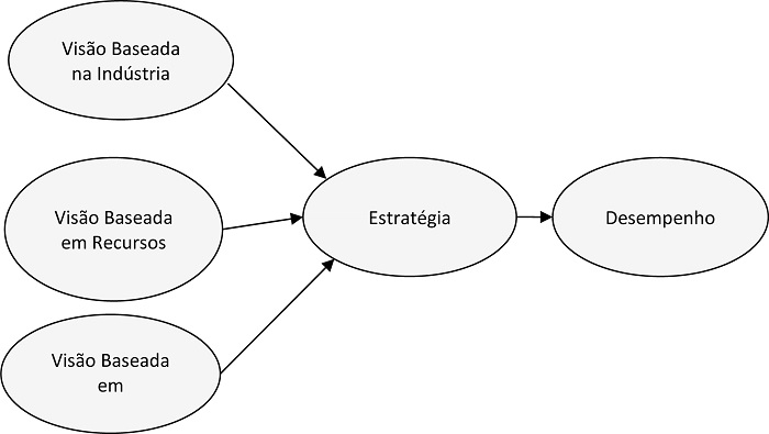 A Figura 1 abaixo mostra como essas três visões, quando alinhadas, favorecem o desenvolvimento da estratégia e melhoram o desempenho da organização. Quando a empresa considera seus aspectos internos, suas capacidades e as instituições que as rodeiam e delimitam seu escopo de atuação, a busca assertiva por uma estratégia eficaz torna-se mais viável. Essa estratégia, por sua vez, por estar bem ajustada, leva a melhor desempenho organizacional.