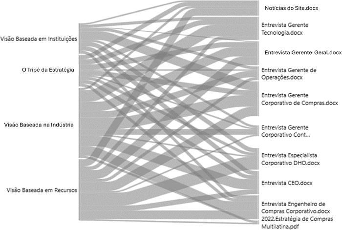 Na Figura 3, onde se destaca a relação entre as categorias de análise, está exemplificado como cada entrevista e documento se relaciona com as subcategorias de análise. É notável que os pilares do tripé da estratégia foram as citadas visões ao longo dos documentos e das entrevistas analisados, evidenciando o impacto na estratégia da empresa.