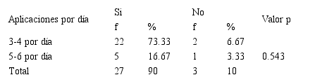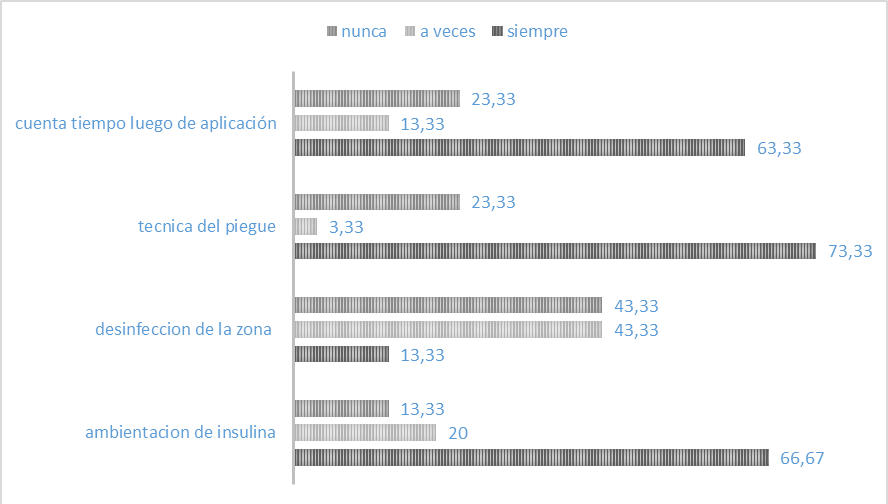 De los diferentes componentes de la técnica de aplicación de insulina, fueron tomados en cuenta cuatro, de los cuales se evidenció que los pacientes diabéticos de este estudio los cumplían en frecuencias siempre, a veces y nunca. es así que la ambientación de la insulina antes de su administración el 66.67% lo realizaban siempre, el 20% a veces y el 13.33% nunca lo hacían; en cuanto a la desinfección de la zona antes de la aplicación a penas el 13.33% lo hacen siempre, y en porcentaje semejante de 43.33% lo hacían a veces y nunca; la técnica de hacer pliegue para una correcta administración de insulina solo es realizada siempre por el 73.33% de los pacientes, el 3.33% a veces y un 23.33% nunca lo realizan; por último, la práctica de contar el tiempo luego de colocada la insulina es cumplida siempre por el 63.33%, en tanto que 13.33% lo hacen a veces y el 23.33% no lo realizan nunca.