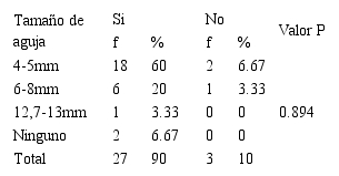 Finalmente, es la aplicación de una mala técnica de administración de insulina la que repercutirá de manera desfavorable con la formación de lipodistrofias en los pacientes. En la presente serie solo el 66.67% ambienta el fármaco antes de la administración, el 26.66% no desinfecta la zona antes de colocarse la medicación ni realiza la técnica del pliegue y solo el 63.33% cuenta el tiempo luego de inyectarse la insulina, sin embargo ninguna de ellas fue un factor de relación directa (p>0.05) para la aparición de lipodistrofias. En la investigación de Díaz Ruiz et.al.14, solamente un 9.9% de los participantes realizaban de forma correcta la técnica, el 13.5% de diabéticos cambian la aguja de forma correcta, el 37.5% se pinchan en la misma zona y un 48.9% no realizan pellizco.