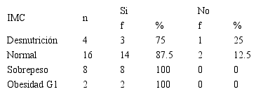 Si bien el IMC puede incidir en la dosis diaria de insulina y la aparición otras patologías no se ha relacionado con la presencia de lipodistrofias, en el presente estudio el 13.33% tenían desnutrición y el 6.67% obesidad G1 y el 53.33% IMC normal sin observar relación estadística entre esta con lipodistrofias.