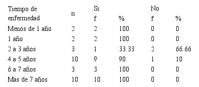 En relación al tiempo de diagnóstico de enfermedad en esta investigación el 66.67% de diabéticos ya tenían más de 4 años enfermedad, este criterio se relaciona directamente (p<0.05) con la aparición de lipodistrofias en los pacientes diabéticos. Según Díaz Ruiz et.al.14, en su estudio encontró que los usuarios con lipodistrofias tenían una media de 5.7 años de cronicidad mientras que los que no presentaban lipodistrofias fue de 6.5 años.15