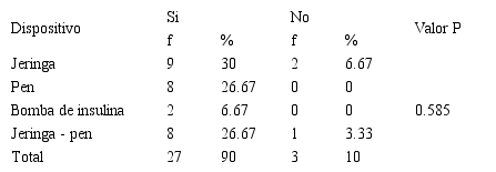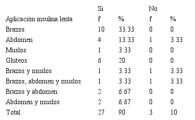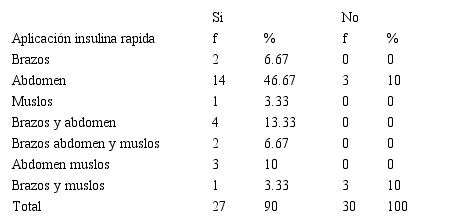 lipodystrophy. Introduction and objectives: Type 1 Diabetes Mellitus it is a frequent pathology in developed and developing countries; in Latin America and the Caribbean its incidence is increasing, therefore, an adequate technique and self-care avoid complications; the purpose of the research being to assess the technique of self-application of insulin and its relationship with lipodystrophy. Materials and methods: An observational, quantitative, cross-sectional cohort study was conducted in 30 patients with Type 1 Diabetes Mellitus. A directed observational record was applied, the data were processed in the SPSS version 15 programs, using statistics of frequency, percentages and incidence rate. Results: Insulin application technique is deficient since only 66.67% of the environment is before administration, 26.66% does not disinfect the area before applying the medication and does not perform the fold technique and only 63.33% counts the time after inject insulin. The incidence of lipodystrophies is 90%, of which 70% occur in the abdomen and 10% in the arms. Introduction and objectives: Type 1 Diabetes Mellitus it is a frequent pathology in developed and developing countries; in Latin America and the Caribbean its incidence is increasing, therefore, an adequate technique and self-care avoid complications; the purpose of the research being to assess the technique of self-application of insulin and its relationship with lipodystrophy. Materials and methods: An observational, quantitative, cross-sectional cohort study was conducted in 30 patients with Type 1 Diabetes Mellitus. A directed observational record was applied, the data were processed in the SPSS version 15 programs, using statistics of frequency, percentages and incidence rate. Results: Insulin application technique is deficient since only 66.67% of the environment is before administration, 26.66% does not disinfect the area before applying the medication and does not perform the fold technique and only 63.33% counts the time after inject insulin. The incidence of lipodystrophies is 90%, of which 70% occur in the abdomen and 10% in the arms. Conclusions: The technique of insulin application is not optimal, the incidence of lipodystrophy is very high.