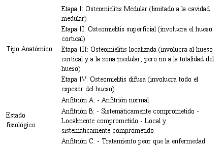 En relación al tipo anatómico, el sistema de clasificación según Cierny–Mader (Tabla 2), la clasifica en varios tipos. La osteomielitis tipo I indica que la infección está limitada a la médula ósea, incluye infecciones hematógenas primarias. La osteomielitis tipo II ocurre principalmente mediante una inoculación directa o un foco contiguo de infección. La osteomielitis tipo III generalmente involucra hueso cortical; aunque la estabilidad del hueso se mantiene, es necesario eliminar las áreas necróticas. La osteomielitis tipo IV indica que todas las capas de hueso están infectadas y que se debe extraer todo el hueso necrótico, por lo tanto; la estabilidad estructural del hueso está comprometida. Sin embargo, es importante tener en cuenta que las categorías de osteomielitis de este sistema de clasificación pueden cambiar dinámicamente según la condición del paciente, la administración de terapia con antibióticos y otros tratamientos28; asimismo, el sistema incluye una clasificación según el estado fisiológico (Tabla 2).
