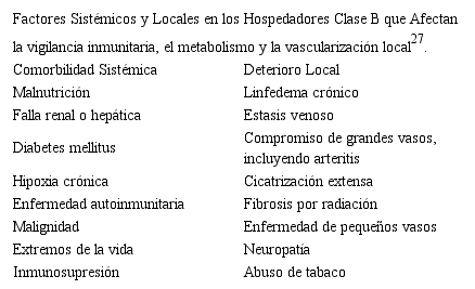 · Factores de riesgo locales: traumatismo, hipoperfusión del área donde ocurre el traumatismo (arteriopatía oclusiva), estasis venosa, linfaedema crónico, arteritis, fibrosis, cicatrización severa de una cirugía previa, colocación de implantes quirúrgicos.
