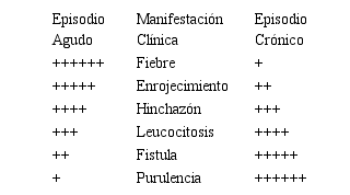 Las manifestaciones clínicas son poco precisas e incluyen dolor crónico, fiebre, escalofríos y presencia de fistulas, al examen físico puede evidenciarse inestabilidad articular, eritema localizado y signos de flogosis. Cada una de estas manifestaciones se presentará en mayor o menor medida dependiendo de si la osteomielitis se encuentra en fase aguda o en fase crónica. (Tabla 3).