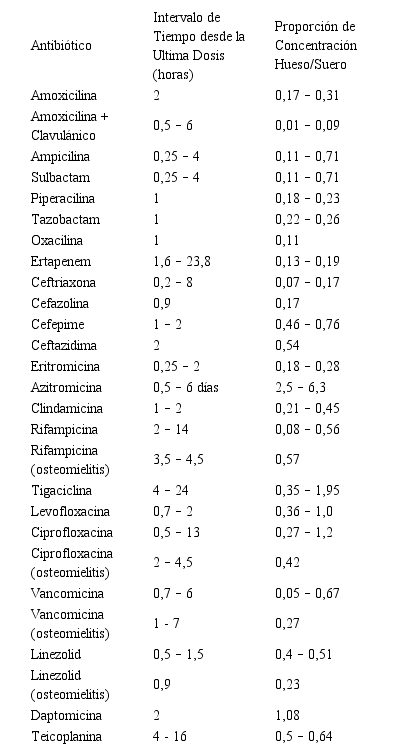 El tratamiento adecuado de la osteomielitis dependerá en gran medida de la capacidad presentada por el antibiótico de elección de penetrar en el tejido óseo (Tabla 4), lo ideal en todos los casos es obtener una muestra por cultivo bacteriano donde se pueda identificar el patógeno y la sensibilidad presentada por el mismo y así optar por un tratamiento farmacológico adecuado e individualizado para cada paciente. Este tratamiento puede llegar a variar en los casos de osteomielitis aguda, en el cual la duración del mismo oscila entre 4 a 6 semanas y puede acompañarse, según cada caso, de procedimientos de desbridamiento y limpieza quirúrgica. Por su parte en la osteomielitis crónica la antibioticoterapia debe utilizarse en promedio un periodo de 3 a 6 meses, en estos casos siempre debe ir acompañado de desbridamiento quirúrgico, uso de antibióticos a nivel sistémico (por vía oral o parenteral) y el uso de dispositivos de liberación del fármaco de acción local.. La extensión del desbridamiento quirúrgico debe ser planeada teniendo en cuenta el tipo de huésped, el área implicada y la probable necesidad de cobertura y estabilización de los tejidos blandos, un desbridamiento adecuado es la clave para el éxito del tratamiento, y todos los tejidos muertos e isquémicos deben eliminarse33.