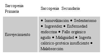 Según el European Working Group on Sarcopenia in Older People (EWGSOP) para el año 2010, la sarcopenia se define como un síndrome caracterizado por la pérdida progresiva generalizada de la fuerza y masa muscular esquelética con riesgo de discapacidad física, peor calidad de vida y muerte6, considerándose sarcopenia primaria cuando no hay factores causales específicos exclusivamente la edad, mientras que la sarcopenia secundaria es aquella que se debe a un factor desencadenante demostrable diferente a la edad (Tabla 1). Posteriormente, el International Working Group on Sarcopenia (IWGS) planteó un algoritmo diagnostico diferente al del grupo previo. y 3 años después el Foundation of NIH Sarcopenia Project aplicó un enfoque analítico de clasificación basado en cohortes estadounidenses para utilizar puntos de corte de las variables ajustados a esta población8.