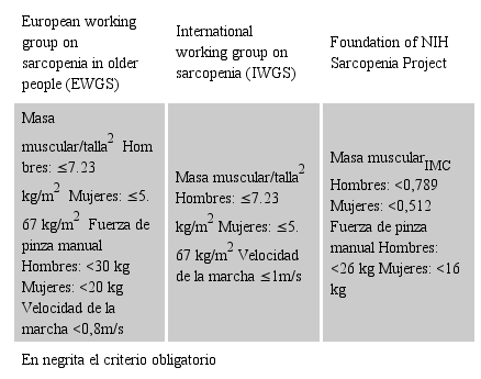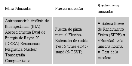 Para el diagnóstico de sarcopenia se han utilizado de manera convencional 3 criterios que abarcan masa, fuerza y rendimiento muscular, cuyas técnicas de medición varían de acuerdo al fin para el cual se empleen (investigación o práctica clínica) (Tabla 2) y cuya combinación de criterios también varía según la organización que se analice (Tabla 3).
