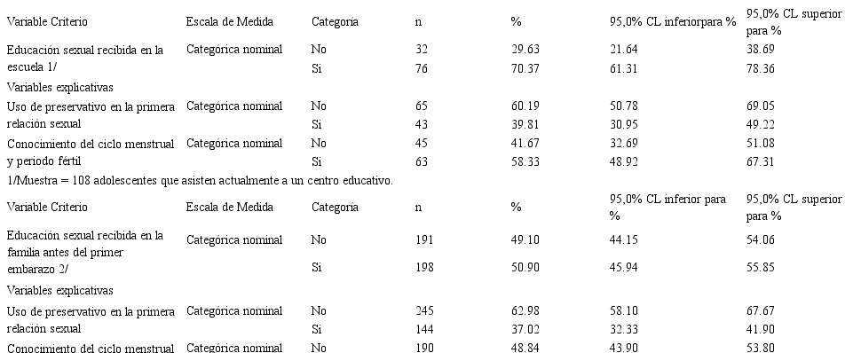 La educación sexual recibida en la escuela y en la familia son definidas como variables dependientes, considerando que las altas tasas de embarazo adolescente en América Latina obedecen a una educación sexual de mala calidad y otros factores de naturaleza, social, económica y cultural como: bajo nivel educativo, no uso o uso inconsistente de métodos anticonceptivos, educación de baja calidad, limitadas alternativas de inserción laboral o ausencia de un proyecto de vida que contenga logros profesionales18.