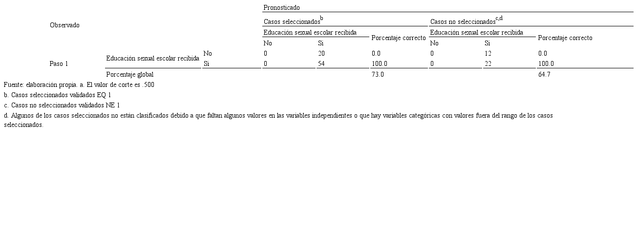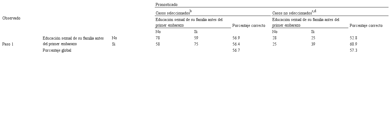 Con estos coeficientes Importar imagen y Importar imagen se construyó la ecuación de regresión logística, para predecir la probabilidad que las adolescentes que recibieron educación sexual en la familia antes del primer embarazo conozcan su ciclo menstrual y periodo fértil. Por lo tanto, la adolescente que conozca su ciclo menstrual y periodo fértil (valor asignado 1) con una probabilidad de haber recibido educación sexual por parte de su familia (Y=1), obtuvo un resultado en la ecuación de .56, derivado del modelo 2 e indica que las adolescentes que conocen su ciclo menstrual y período fértil tienen una probabilidad asociada del 56% de haber recibido educación sexual en su familia antes del primer embarazo.
