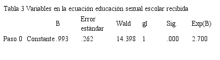 La Tabla 3 muestra las variables que no se encuentran en la ecuación, donde ambas variables se excluyen del modelo (uso del preservativo en la primera relación sexual con un nivel de significancia . = .439 > .05 y conocimiento del ciclo menstrual y período fértil con un nivel de significancia de . = .555 > .05), es decir se evidencia que no se presentan relaciones estadísticamente significativas entre la variable conocimiento del ciclo menstrual y periodo fértil y la variable Educación sexual recibida en la escuela.