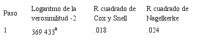 La Tabla 5 muestra el resumen del modelo Educación sexual recibida en la familia antes del primer embarazo, el estadístico log de la verosimilitud (-2LL) o desviación de 369.433, mide hasta qué punto el modelo se ajusta a los datos. El R cuadrado de Cox y Snell estima un valor de .018 lo cual indica que solo el 1.8% de la proporción de la varianza de la variable dependiente Educación sexual recibida en la familia antes del primer embarazo, es explicada por la variable explicativa Conocimiento del ciclo menstrual y periodo fértil. Por otra parte, el estadístico R cuadrado de Nagelkerke (versión corregida de la R cuadrado de Cox y Snell), señala que solo el 2.4% de la proporción de varianza de la variable dependiente Educación sexual recibida en la familia antes del primer embarazo es explicada por la variable explicativa Conocimiento del ciclo menstrual.