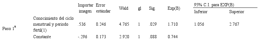 La Tabla 6, muestra la variable que permiten construir la ecuación: conocimiento del ciclo menstrual y período fértil. Se hace la salvedad que la variable explicativa: uso del preservativo en la primera relación sexual fue excluida del modelo por no presentar significancia estadística . = .382 > .05.