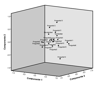 Se empleó una escala tipo Likert para analizar si existían correlaciones entre las variables estudiadas, sin encontrar asociación alguna para la población estudiada (Tabla 5). La correlación de variables se llevó a cabo por medio de un análisis multivariado de componentes principales (empleando prueba de KMO y Bartletta para evaluar la confiabilidad de la matriz) para encontrar diferencias y similitudes respecto a las tres dimensiones y las variables escolaridad, edad y estrato socioeconómico. No se halló segregación de los grupos analizados lo que significa que ambos grupos son homogéneos para las variables estudiadas (figura 1).