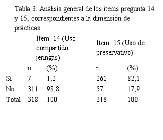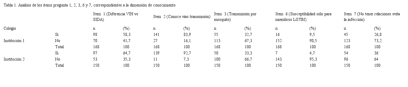 Results. There was a lack of knowledge about transmission, susceptible population and condom stability in 5-47% of the students, resulting in a low level for the knowledge dimension, in contrast with appropriate attitudes and practices.