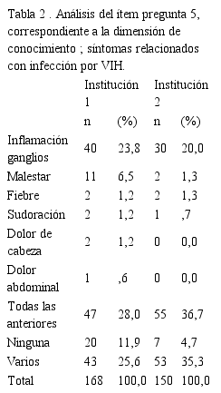 La cuantificación de la encuesta arrojó un nivel bajo para la dimensión conocimiento (dicotomización alto/bajo), para un 76,4% de la población, cuyo análisis revela que el 84 y 93% (para cada Institución) de la misma afirma conocer las vías de transmisión del VIH, aunque hasta el 33,3% considera que ésta pueda ocurrir a partir de mosquitos; la mayoría no considera como únicas, tanto a la vía sexual para adquirir la infección, como a la comunidad LGTBI en torno a susceptibilidad (64 al 73,2% y 90,5 al 95,3%, respectivamente) (Tabla 1). Si bien el 61,3-63,7% tiene claro que algunas veces durante el embarazo existe riesgo de transmisión, un 6,5-8,0% no reconoce el riesgo de transmisión materno-fetal. Cuando se indagó acerca del reconocimiento de síntomas relacionados con la infección, la mayoría señaló que varios o todos (Tabla 2), en reflejo de una capacidad de identificar señales clínicas de alerta. De manera preocupante, entre un 38 y 47% de los estudiantes considera que la fecha de vencimiento de un preservativo debe ser de apenas 1 año, similar a la frecuencia que refirió desconocer éste aspecto (35,1 y 48%); sólo 11,3 y 16,1% aciertan en una vigencia de 3 años.