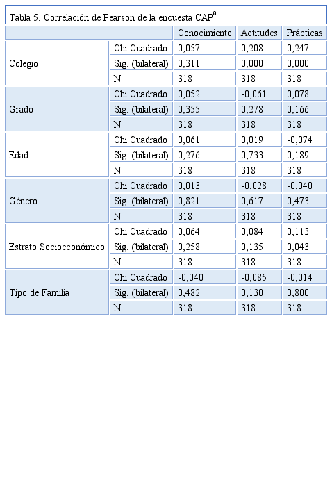 Methods. A correlational field study was conducted in 318 students of 13-21 years of age, between ninth to eleventh grade of two representative Educational Institutions of the city of Cúcuta, by probabilistic sampling. Validated CAP instrument (survey) and sociodemographic evidence were implemented for descriptive and correlational analysis.
