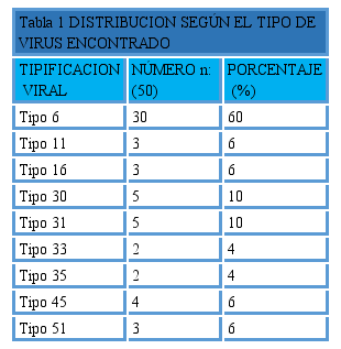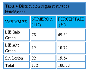 En relación con el resultado de la tipificación viral, 50 pacientes (44,6%) resultaron positivas. Como se observa en la tabla 2 de estas 50 pacientes ,30 pacientes (60% presentaron tipificación positiva para un solo tipo de virus el 6 y 7 pacientes (14%) para más de un tipo viral (Z= 14,596 P=0,001). Hubo 62 pacientes (55%) con resultados negativos para tipificación viral. En los 7 casos donde se observó más de un tipo viral, las combinaciones fueron 6-11, 6-16, 6-33, 6-51, 11-51 (un caso cada uno). Entre las pacientes positivas, se observó con mayor frecuencia el virus 6 con 30pacientes (60%), seguido por el virus 30 y 31 con 5 pacientes (10%),cada uno y el tipo 45 con 4 (6%) El resto de los tipos virales se evidencian en la tabla 2. La distribución de las pacientes según el resultado de la citología se representa en la tabla 3 donde destaca la presencia de 63 casos (56,25%) con hallazgos sugestivos de lesión intraepitelial cervical de bajo grado (57%), y 7 (6,25%) con hallazgos sugestivos de lesión intraepitelial cervical de alto grado 36 casos (32%) negativos para lesión y 6 casos (5,35%) ASCUS. Las lesiones colposcópicas se describen en la Tabla 5, observándose que 24 pacientes (21,4%) presentaron colposcopias normales; hubo 5 casos de colpitis (4,4%) y 82 casos con cambios colposcópicos. Con respecto a los hallazgos histológicos cervicales, la Tabla 5 muestra que de las 112 pacientes, 78 casos (69,4%) se obtuvieron reportes de NIC 1 o LIE BG y 12 casos (10,7%) positivos para NIC 2 o LIE AG. Las lesiones estuvieron ubicadas en exocérvix en 55 casos (72,3%), en endocérvix en 3 pacientes (4%) y en 2 casos se ubicaron en exocérvix y endocérvix (2,6%). En 22 pacientes no se demostró lesión histológica (19,6%).