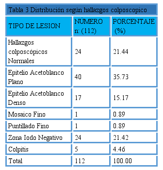 En este estudio la presencia del VPH mediante la realización de la PCR, determinó que el genotipo de VPH más frecuente fue el tipo 6, reproduciendo así los hallazgos descritos a nivel mundial a pesar de que en este estudio el rango con respecto a la edad es de 15 a 44 años. Igualmente, se demostró que el hallazgo colposcópico más frecuente fue el epitelio acetoblanco plano, presente en 40 pacientes (35,71%), seguido por hallazgos colposcópicos normales 24 pacientes (21,40%) coincidiendo con Oakeshott y col.22, quienes describen un predominio de las imágenes acetoblancas a nivel cervical con un 76,56%21.