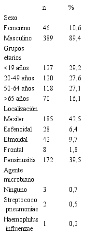 Methodology: a descriptive, non-experimental, retrospective study was conducted in 435 patients who were evaluated in this center with the diagnoses of acute maxillary sinusitis, acute ethmoidal sinusitis, acute pansinusitis, other acute sinusitis, unspecified acute sinusitis, sinusitis chronic maxilla, chronic ethmoidal sinusitis, chronic ethmoid sinusitis, and chronic pansinusitis. The data were obtained from the hospital clinical records and were analyzed using the software SPSS v.19.