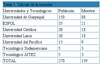 Tomando en cuenta a 100 docentes de Institutos de Educación superior en la ciudad de Guayaquil, no superan los 100.000 individuos, para determinar su tamaño muestral se empleó la fórmula para la población finita. La encuesta se le efectuó a 159 docentes de Institutos de Educación superior en la ciudad de Guayaquil.