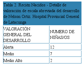 En el presente estudio 61,76% de los pacientes evaluados presentaron una puntuación de Apagar igual o menos a 6, esta población presenta un 47% de estado alerta al aplicar el instrumento de valoración del desarrollo motor grueso. La Escala Abreviada del Desarrollo (EAD) de Nelson Ortiz aporta la posibilidad de detectar tempranamente en los niños y niñas alteraciones de su proceso de desarrollo, con el fin de tomar medidas preventivas y de rehabilitación oportunas8. Se utilizó la EAD Nelson Ortiz porque es una herramienta estandarizada para una población con características similares a la población de niños en el Ecuador, porque suministra un resultado global y en detalle de cada una de las áreas del desarrollo.