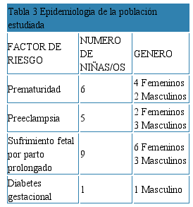 Fueron evaluadas las historias clínicas de 34 pacientes, de los cuales 21 (12 niñas y 9 niños) presentaron una puntuación de Apagar igual o menos a 6 (tabla 1). En la tabla 2, se aprecian los resultados de la aplicación de la escala abreviada del desarrollo de Nelson Ortiz. Una vez revisada la historia clínica de los pacientes además de constatar el grado de asfixia que sufrieron al momento del nacimiento, se pudo asociar a factores de riesgo materno, fetal y perinatal, tabla 3. Con los datos obtenidos y la información recopilada se pudo determinar y establecer una relación entre un evento adverso como es la asfixia perinatal y posibles alteraciones del desarrollo motor destacando como principal etiología el Sufrimiento fetal por parto prolongado (9 casos), seguido de la prematuridad (6 casos).