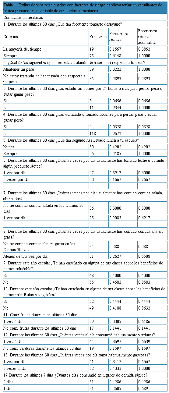 En la tabla 1, se evidencia que los estudiantes respondieron en lo concerniente a los estilos de vida en un alto porcentaje en conductas alimentarias que ellos siempre desayunan y han mantenido su peso, que en los últimos 30 días no han realizado ninguna actividad para perder o ganar peso; además no llevan lunch a la escuela. Así mismo, en un alto porcentaje han tomado productos lácteos una vez al día y otras 2 veces; no han comido comida salada, grasosa en los últimos 30 días, y menos de una vez por día.