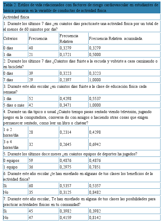 Con respecto a la variable de actividad fisca se evidencia en la tabla 2 que los adolescentes manifestaron en mayor proporción no practicar una actividad física al menos de 60 minutos por día, que si asiste a las clase de educación física; también pasa tiempo sentado viendo televisión, jugando juegos en la computadora, conversando con amigos o haciendo otras cosas que exigen permanecer sentado, como leer un libro o chatear; cabe resaltar que los adolescentes no están en un equipo de deportes, sin embargo, durante el año escolar si le han enseñado en las clases los beneficios de la actividad física, pero no le han enseñado en clases las posibilidades de practicar actividades físicas en la comunidad. Solo una minoría si realiza durante los últimos 7 días para ir a la escuela y volver a casa caminando o en bicicleta. Evidenciándose que es poca la actividad física que realiza estos adolescentes, es por ello es importante enseñar estrategias de promoción de la salud y prevención de enfermedades.