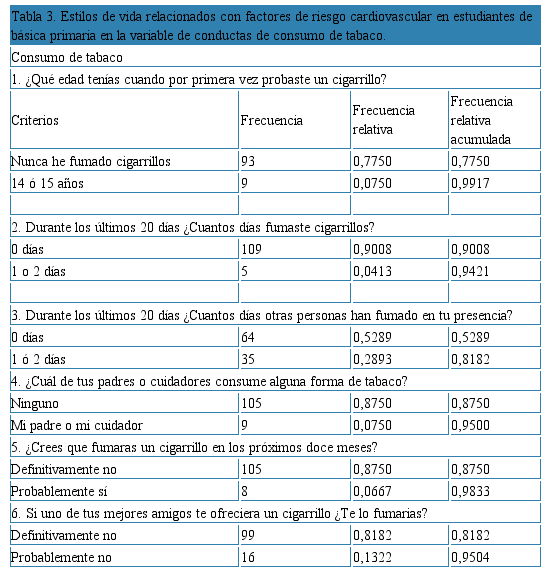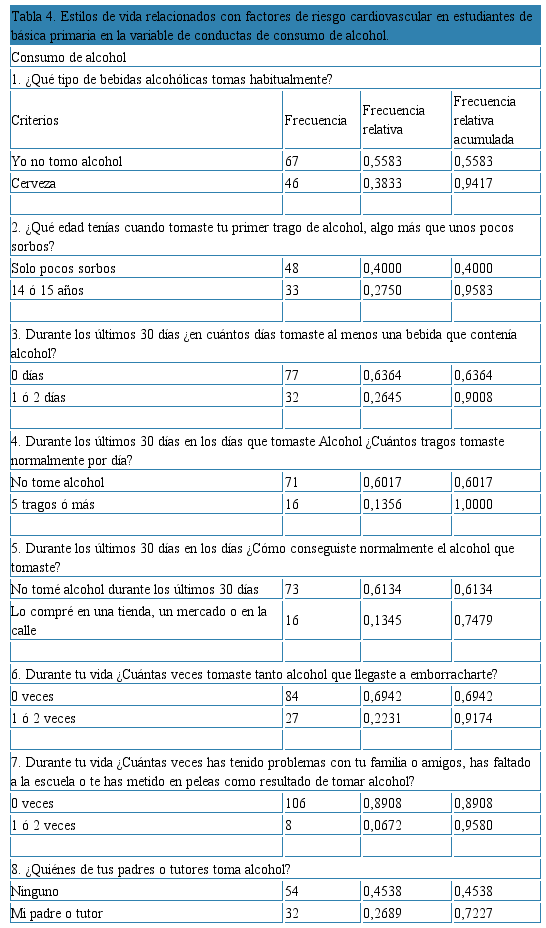 Abstract: Objective: To identify cardiovascular risk factors related to lifestyles in students of a District school. Materials and Methods: descriptive, cross-sectional study population was 401, choosing a sample of 196 students. The World School Health Survey instrument was used, which evaluated food, physical activity, tobacco and alcohol consumption. For the processing and analysis of information, the Epi-info program Results: the risk factors related to food behavior in the students indicated the consumption of sugary drinks. There was evidence of a sedentary lifestyle in adolescents; does not consume alcohol, showing the beginning of consumption of 14 to 15 years, beer the favorite drink; the non-consumption of tobacco stands out. Conclusion: some variables are protective factors present in young people as the non-consumption of tobacco, alcohol, food as the consumption of fruits, vegetables and decrease in fatty foods; being compatible with the current policies of the School Feeding Program in the country. This research contributes to promote health from an early age.