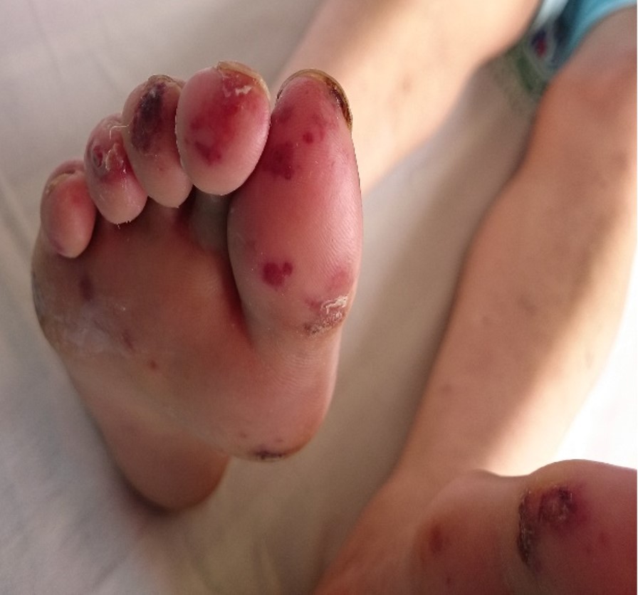 Al examen físico: PA: 90/60, FC: 88 min, FR: 20, SAT O2: 90%, T: 38ºC, se aprecia en piel: lesiones necrotizantes puntiformes coalescentes, algunas ulceradas, lesiones purpúricas palpables y otras no palpables, costrosas, localizadas en extremidades y lesiones vesiculares localizados en manos y pies (Figura 1 y 2). Presenta eritema malar y en el dorso de la nariz presenta lesión ulcerativa de aproximadamente 1 cm rodeada de halo eritematoso, con lesiones costrosas dentro de fosas nasales. Conjuntivas pálidas, mucosas orales semihúmedas, no presenta rigidez nucal, se palpa adenopatías móviles, no dolorosas, de aproximadamente 1 cm, cervicales, axilares, trocleares, inguinales y en fosa supraclavicular izquierda. Tórax: simétrico, expansibilidad y frémito conservado, corazón rítmico, hipofonético, no se ausculta soplos, murmullo vesicular disminuido en bases, sin ruidos sobreañadidos. Abdomen: suave, depresible, doloroso a la palpación profunda en epigastrio e hipocondrio derecho, Murphy negativo, ruidos hidroaereos aumentados. Extremidades superiores: simétricas, se observan lesiones costrosas necrotizantes en dedos de las manos, previamente descritas, asimismo en las extremidades inferiores se observan las lesiones costrosas necrotizantes acompañadas de lesiones vesiculares en dedos de los pies, no dolorosas a la digito-presión, pulsos distales presentes, tono, fuerza y sensibilidad conservada. Neurológicamente consciente, orientada en las tres esferas, no existen signos de focalidad neurológica, ni signos de irritación meníngea.
