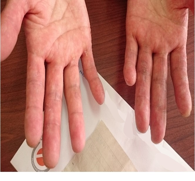 Paciente femenina de 32 años, viuda, católica, mestiza, nacida y residente en Guaytacama, cantón de Latacunga-Ecuador, instrucción primaria completa, con antecedentes personales de artritis reumatoide diagnosticada hace 2 años y enfermedad ulcero-péptica diagnosticada hace 1 año, sin tratamiento. No refiere antecedentes quirúrgicos y familiares de importancia, sin alergias, ni hábitos tóxicos. La paciente refiere que desde hace 6 meses presenta lesiones eritematosas puntiformes con tendencia a la coalescencia a nivel de dedos de manos y pies, las cuales se tornan dolorosas en la última semana, con áreas de necrosis. Posteriormente, las lesiones aparecen en el rostro y desde hace 8 días presenta alza térmica no cuantificada, con predominio nocturno, sin causa aparente. Presenta tos productiva con expectoración blanquecina esporádica de poca cantidad, anorexia, artralgias de las cuatro extremidades sin edema, náuseas sin llegar a presentar vómitos, deposiciones diarreicas líquidas de color negruzcas de mal olor por varias ocasiones y epistaxis. Este cuadro se acompaña desde hace 3 meses con pérdida de peso de aproximadamente 6 libras. Narra historia de fotosensibilidad en su rostro.