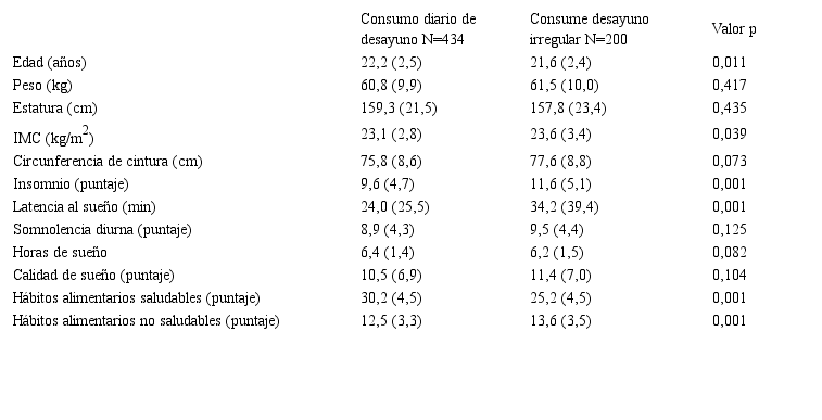 Tabla 2. Comparación de variables antropométricas, de sueño y alimentarios entre sujetos que consumen siempre desayuno o de forma irregular