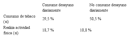 En la Tabla 3 se observa que los estudiantes que desayunan consumen menos tabaco y realizan más actividad física que aquellos que no lo hacen.