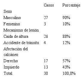 Results: The total number of patients with calcaneal fracture was 34; four patients were excluded because they either had open fractures (n=2) or non-articular ones (n=2). The study was comprised of 30 patients, 90% men and 8% women (10%) with a mean age of 30 years. The most common mechanism of injury was fall from a high place (87%) and traffic accidents (13%). In 57% of the cases, the right side was the one affected whilst in 43% the left side was the one affected. 84% of the patients presented a good evolution.
