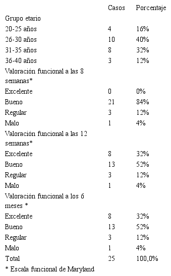 La edad más frecuente fue la de menor de 30 años (20-25 años: 40,0% y 26-30 años: 32,0%), con un promedio de edad de 30 años. La evaluación con escala funcional de Maryland en pacientes atendidos a las 8 semanas fue mayoritaria buena con 84%, a las 12 semanas fue satisfactoria con un 52% buena y 32% excelente; con un comportamiento similar a los 6 meses, Tabla 2.