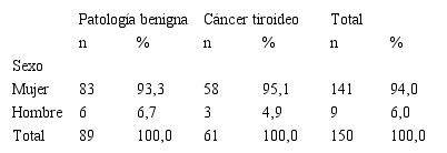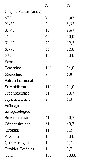 Se estudiaron un total de 150 pacientes con hallazgos de enfermedad nodular tiroidea intervenidos quirúrgicamente. El 94% correspondió a la población femenina y el 6% a la población masculina. El grupo en general tuvo un promedio de edad de 51,49±14,80 años. El grupo etario más frecuente estuvo conformado por pacientes de 41 a 50 años, representando el 30% de la muestra, seguido por los pacientes de 61 a 70 años, conformando el 22%. La mayoría de los pacientes tuvo un patrón hormonal de eutiroidismo (74,0%). Los hallazgos histopatológicos fueron el bocio coloide con 40,7%; cáncer tiroideo 40,7%; adenoma 10,0%; tiroiditis 7,2%; quiste tirogloso 0,7% y tiroides ectópica 0,7%, Tabla 1. La etiología nodular se pudo clasificar como maligna (40,7%; n=61), y benigna con 59,3% (n=89), distribuidos en: bocio coloide 68,5%; adenoma 16,9% tiroiditis 12,4%; quiste tirogloso 1,1% y tiroides ectópica 1,1%.