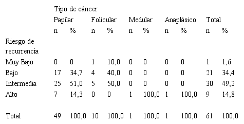 Se estudió el riesgo de recurrencia del carcinoma tiroideo, el cual depende de varios factores, como la edad, género o tipo histológico y se lo dividió en muy bajo riesgo, bajo riesgo, intermedio y alto riesgo. El cáncer papilar se ubicó en mayor porcentaje en riesgo de recurrencia intermedio con un 51,0%, al igual que el folicular con 50,0%; mientras que el 100,0% de casos con cáncer medular y anaplásico se encontraron dentro de la categoría de alto riesgo, concordando con lo que se ha descrito sobre la recurrencia de cáncer medular de tiroides y anaplásico debido a la alta malignidad que poseen estos dos tipos histológicos de cáncer tiroideo22.