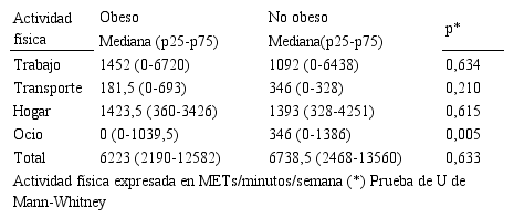 Del total de 530 individuos adultos, el 17,7% (n=94) tuvo obesidad, siendo mayor en las mujeres (20,4%; n=64) comparado a los hombres (13,8%; n=30). Al evaluar el comportamiento de la actividad física según los diferentes dominios en obesos y no obesos, se encontró que la única actividad física que mostró una diferencia estadísticamente significativa fue la de ocio [obesos: 0 (0-1039) METs/min/sem vs. no obesos: 346 (0-1386) METs/min/sem; .=0,005], Tabla 1.